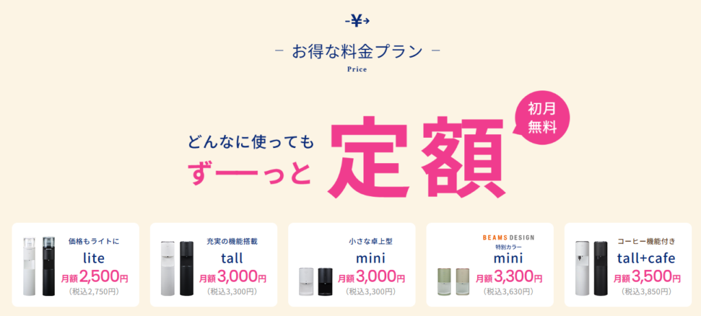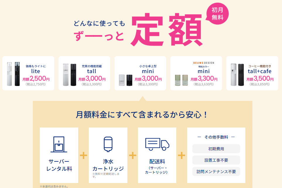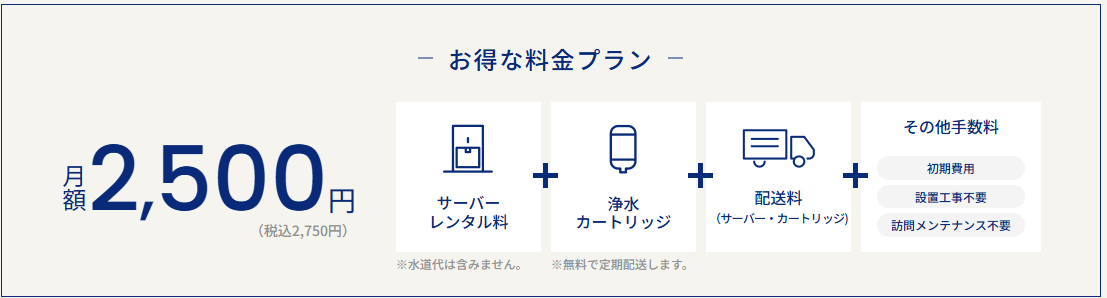 | 月額料金 | 水代3,180円(税込/24L)~ |
