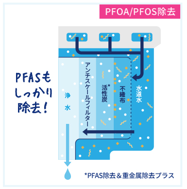 エブリィフレシャスは、不純物を46種類除去可能な高性能浄水カートリッジを採用。PFAS(PFOS/PFOA等)に対しても、99%以上の除去率を実証済みです。
