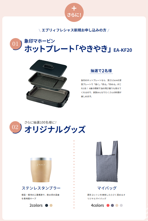 抽選で 象印ホットプレート「やきやき」(2名様) や、オリジナル限定グッズ(100名様) が当たります。