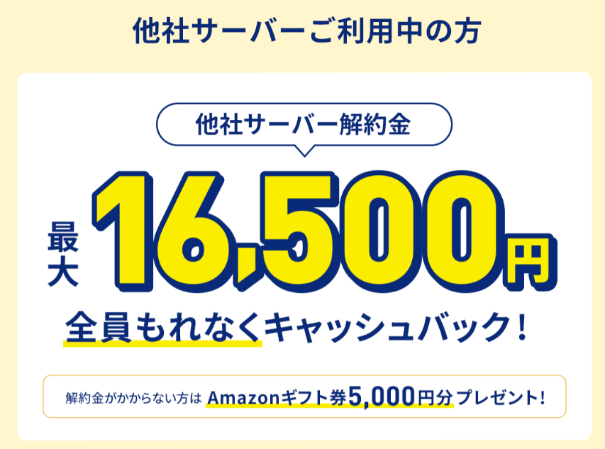 また、他社サーバーからの乗り換えで、最大16,500円の解約金をキャッシュバック!解約金がかからない方にはAmazonギフト券5,000円をプレゼントしています。