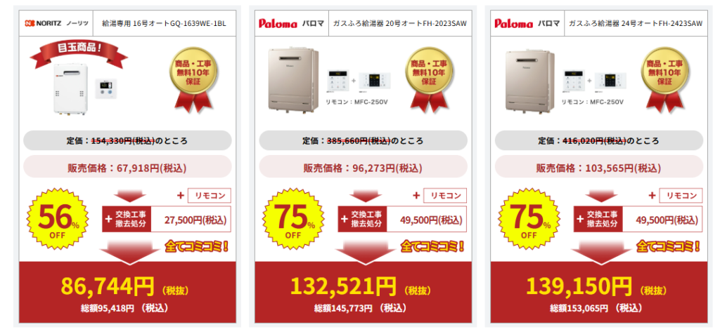 給湯器駆けつけ隊は、メーカーからの直接仕入れ+自社スタッフ施工だから、中間マージンをカット。だからこそ、本体価格が最大91%OFFという圧倒的な安さを実現しています。
