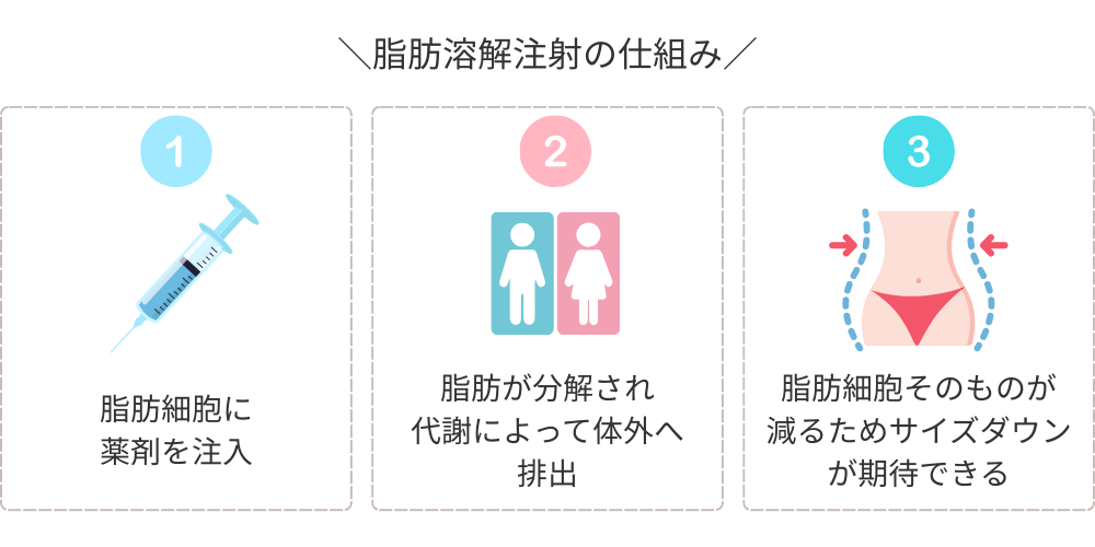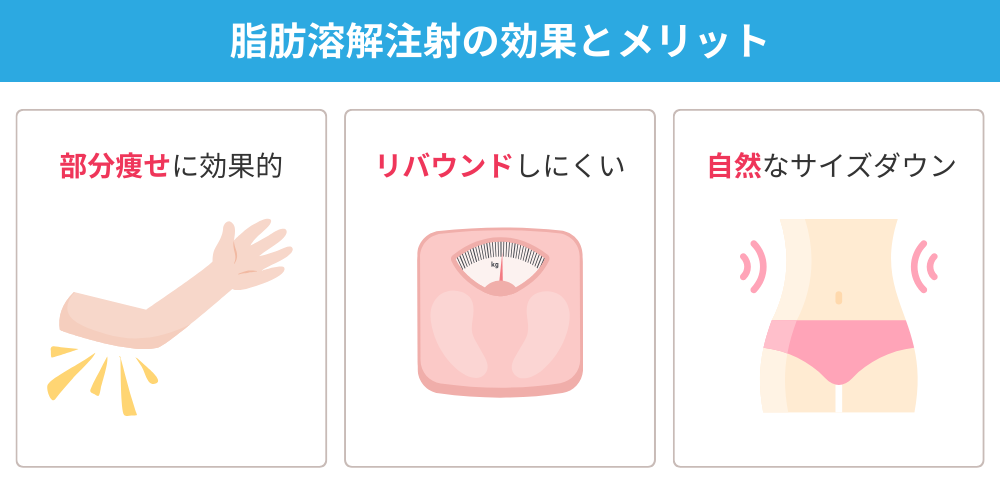 脂肪溶解注射は、顔や二の腕・お腹・太ももなど落ちにくい脂肪に直接アプローチでき、脂肪細胞自体を減らすことでリバウンドしにくく、さらに徐々に排出されるため自然なサイズダウンが期待できます。
